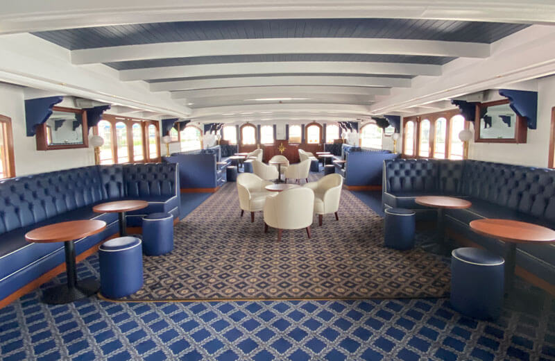 There are several other extensive additions to improve guests’ comfort and experience on board. Air conditioning has been installed on the lower deck, whilst banquet seating on the upper deck has also been replaced by sumptuous booths designed to make the space more intimate and luxurious. They perfectly match the exclusively designed Axminster carpet that has been laid throughout.